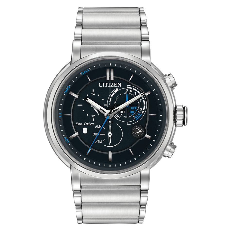 - This model appears in a stainless steel case and bracelet, black dial with bright blue details.